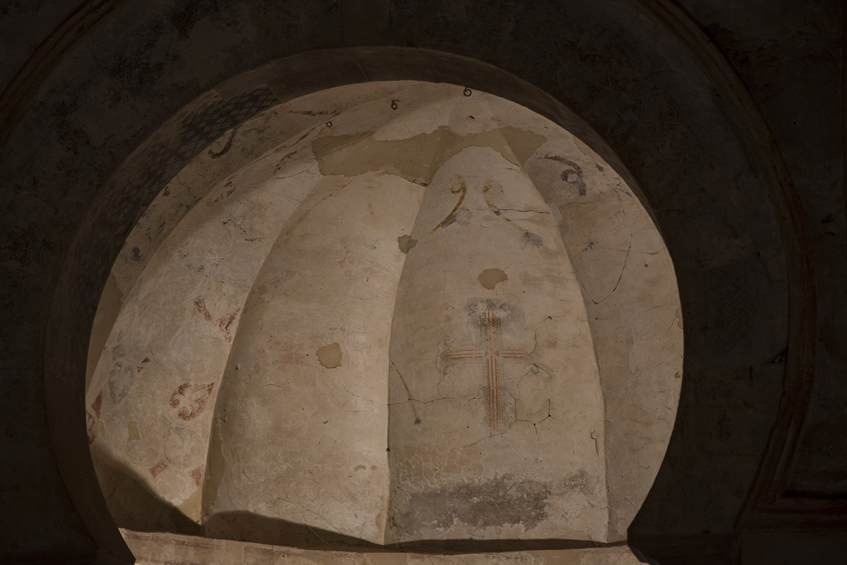 Su interior consta de una sola nave a la que se unen dos capillas mediante arcos de herradu¬ra, dándole forma de planta de cruz latina. La nave está rematada en sus extremos por ábsides cubiertos con bóvedas gallonadas. Son visibles pinturas originales de la época califal.